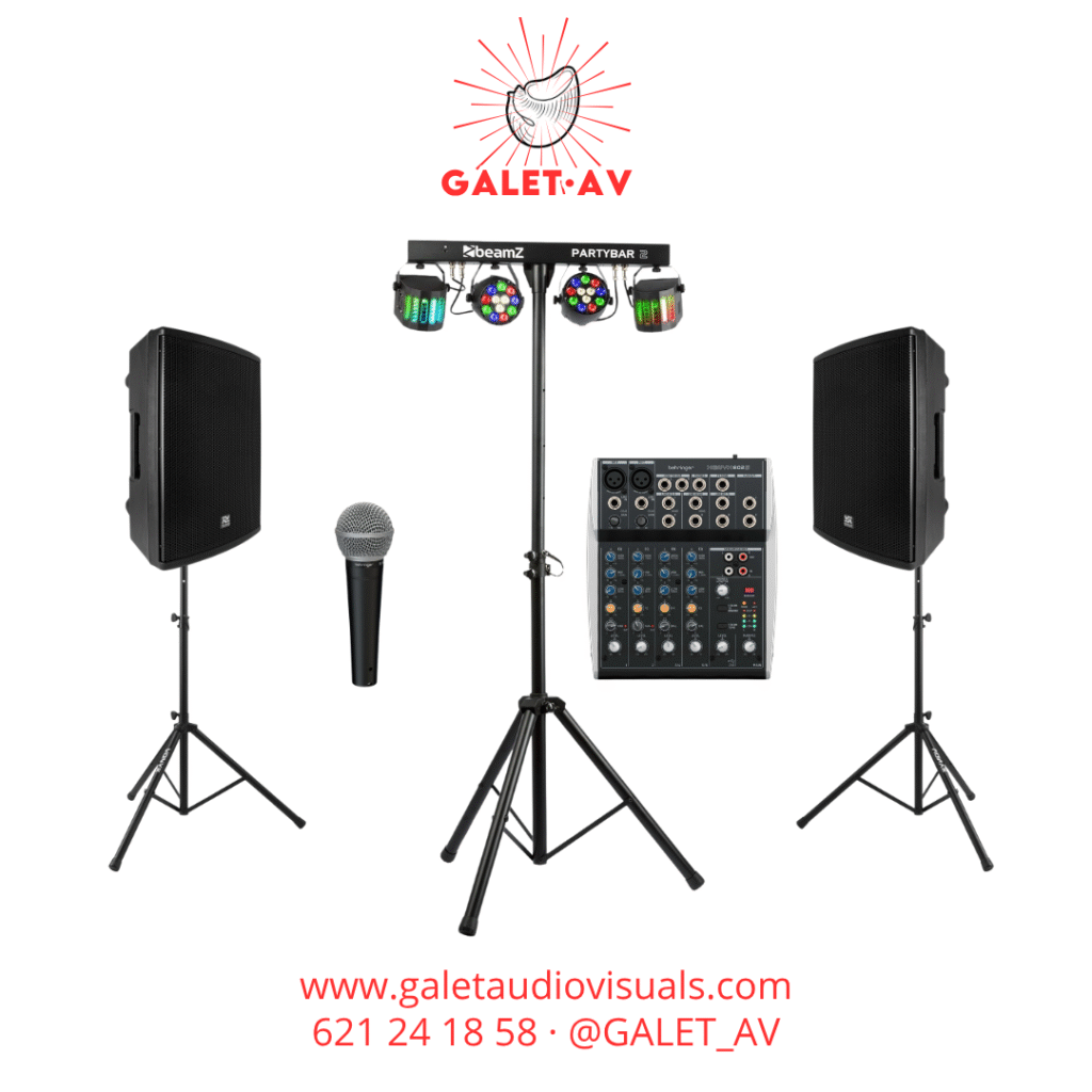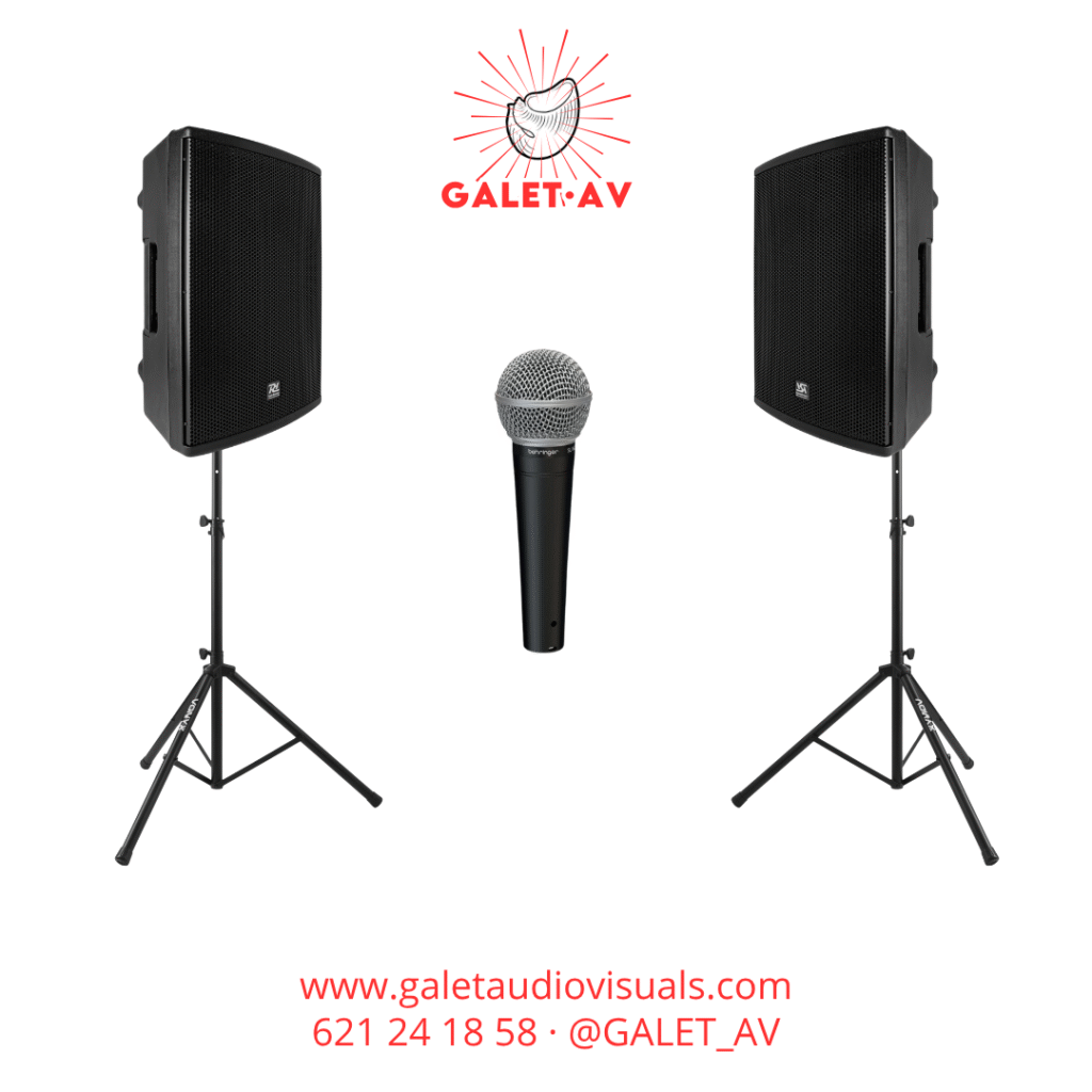 Comptem amb tota mena de material audiovisual com Altaveus, micròfons, pantalles i projectors. També comptem amb tot el necessari per poder cobrir tota classe de muntatges, com torres, suports d’altaveu i micròfon, i tota classe de cablejat com canons xlr, jacks.
